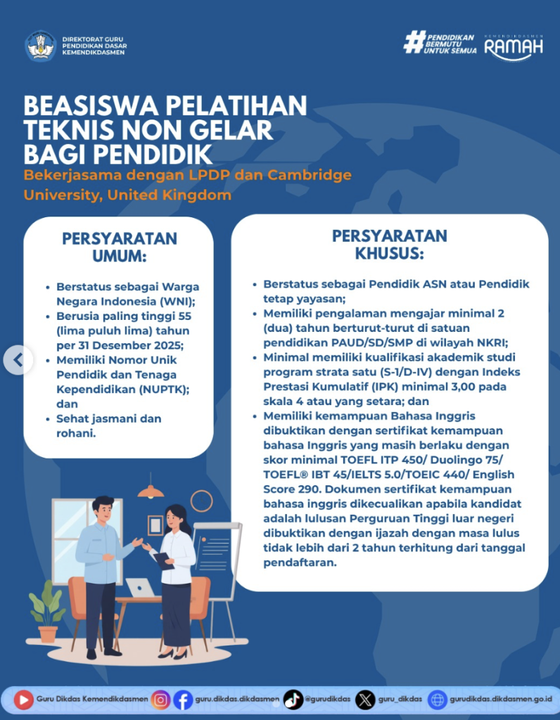 Kabar baik bagi para pendidik di seluruh Indonesia! Kementerian Pendidikan Dasar dan Menengah melalui kerja sama dengan Lembaga Pengelola Dana Pendidikan (LPDP) dan Cambridge University, United Kingdom, membuka kesempatan mengikuti Beasiswa Pelatihan Teknis Non Gelar dalam bidang Pengembangan Profesional Literacy, Teaching, Reading, and Writing.