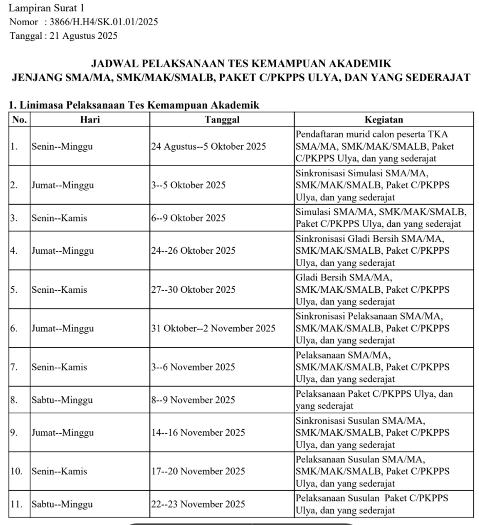 Berikut tanggal pelaksanaan tes kemampuan akademik tahun 2025