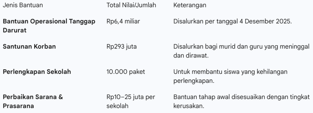 Kemendikdasmen telah menyalurkan bantuan finansial dan materiel yang signifikan sebagai langkah tanggap darurat:
