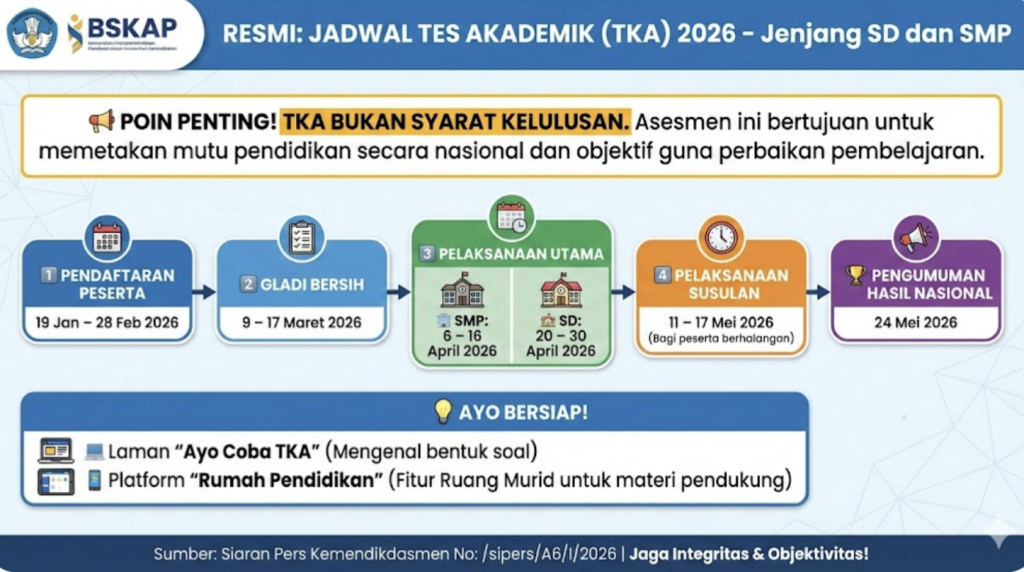 GuruBelajar.com – Kementerian Pendidikan Dasar dan Menengah (Kemendikdasmen) melalui Badan Standar, Kurikulum, dan Asesmen Pendidikan (BSKAP) secara resmi telah menetapkan jadwal pelaksanaan Tes Akademik (TKA) tahun 2026 untuk jenjang Sekolah Dasar (SD) dan Sekolah Menengah Pertama (SMP). TKA tahun ini dirancang sebagai instrumen pemetaan kemampuan akademik murid secara nasional yang objektif dan terstandar. Pemerintah menegaskan bahwa hasil TKA tidak akan menjadi penentu kelulusan siswa, melainkan potret untuk perbaikan mutu pendidikan.