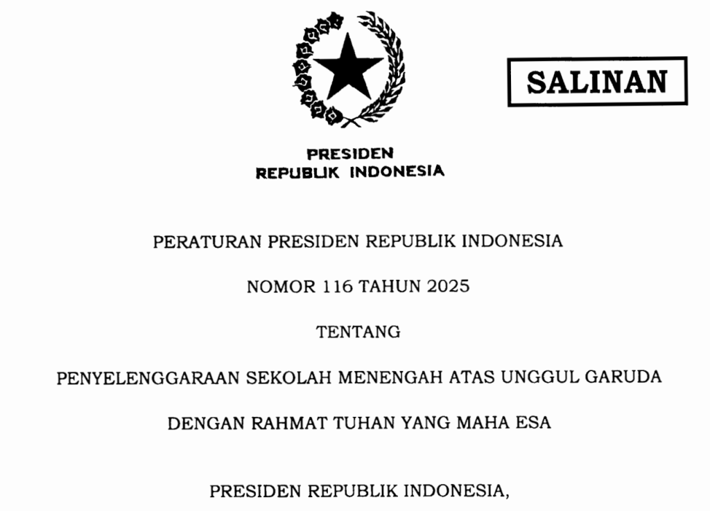 GuruBelajar.com – Pemerintah secara resmi menetapkan Peraturan Presiden Republik Indonesia (Perpres) Nomor 116 Tahun 2025 tentang Penyelenggaraan Sekolah Menengah Atas (SMA) Unggul Garuda. Aturan ini ditandatangani oleh Presiden Prabowo Subianto pada 20 November 2025 sebagai langkah strategis memperkuat kualitas sumber daya manusia (SDM) Indonesia.