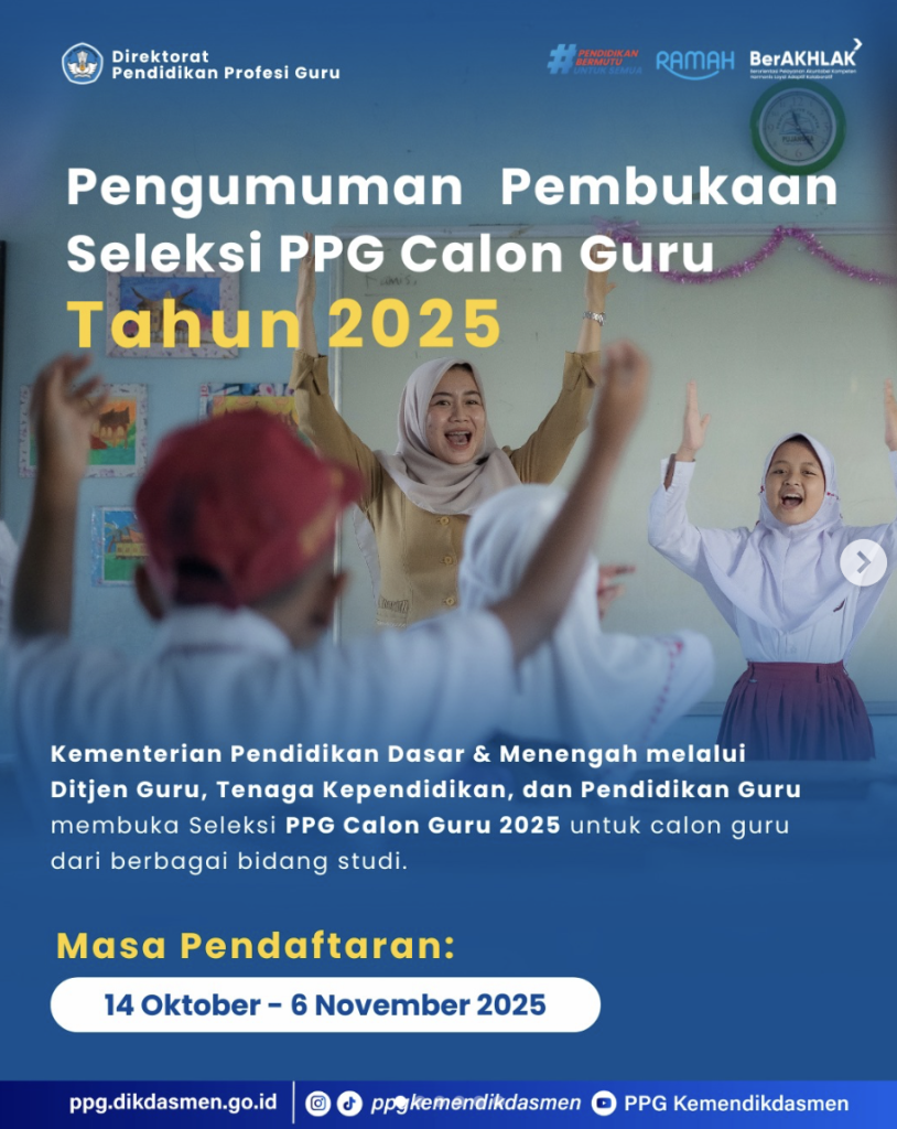 JAKARTA – Kabar gembira bagi lulusan S1/D4 yang bercita-cita menjadi guru profesional. Kementerian Pendidikan Dasar dan Menengah (Kemendikdasmen), melalui Direktorat Pendidikan Profesi Guru, secara resmi membuka Seleksi Pendidikan Profesi Guru (PPG) Calon Guru (Prajabatan) Tahun 2025.